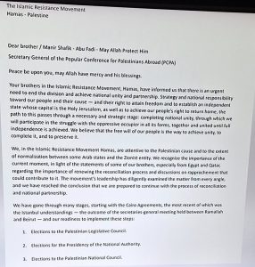 A Hamas letter addressed to the PCPA’s Secretary General calls for national unity and outlines a political strategy. It praises the struggle against the occupier and demands elections for Palestinian institutions. This is not a peace plan. It is a roadmap to strengthen Hamas’s grip on Palestinian politics. It shows a movement that is deeply embedded with Hamas leadership and that serves as an echo chamber for Hamas talking points abroad.